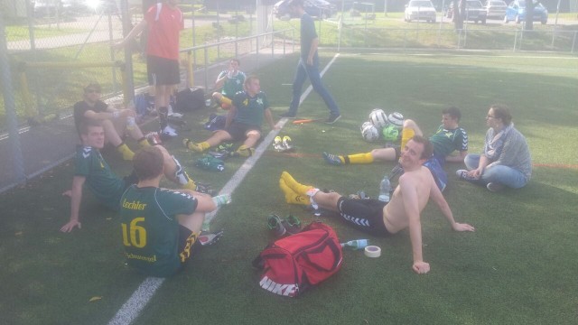 Die zweite Hälfte begann turbulent. Nach einem schlechten Rückpass kam der Stürmer von Tornado im Strafraum von uns zu Fall und der Schiedsrichter hatte keine andere Wahl, als auf den Punkt zu zeigen. Der Torwart wurde verladen und es stand 2:1! Das Spiel wurde hitziger und die kleinlichen Fouls mehrten sich. Durch einen erneuten Fehler und Fehlkommunikation mit dem Schiedsrichter nutzte Tornado die Verwirrung und schob in der 52. Minute zum 3:1 ein. Nach einer rüden Attacke gegen unsere Nummer 10 von hinten im Mittelfeld war Tornado mit sehr viel Glück gesegnet, noch mit 11 Mann weiterspielen zu dürfen. Der folgende Freistoß (ausgeführt vom Kapitän Matthias Daniels) wurde vom eben gefoulten Timo Steeb per Kopf zum 3:2 Anschlusstreffer genutzt und somit war ab der 55. Minute wieder alles drin und der Gegner auch schon so gut wie K.O.. Knappe 5 Minuten später und ein Angriff nach dem anderen von uns, staubte Timo Steeb nach Vorarbeit von Philipp Müller in der 60. Minute zum 3:3 ab. Zwei Wechsel und 10 Minuten später erlöste uns Torsten Franken mit seinem zweiten Tor. Nach starkem Ball von Matthias Daniels in den Lauf setze er den Ball ins lange Eck und ließ dem Torwart keine Chance. Unser neuer Youngster Florian Wilhelm musste leider kurz nach seiner Einwechslung wieder ausgewechselt werden da er kurz vor dem Tor noch von einem heranstürmenden Abwehrspieler gestoppt wurde und dabei ein Stück seines Zahns verlor.